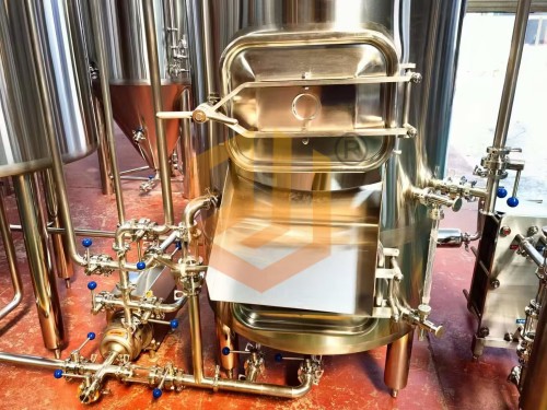 過濾槽與旋沉罐:采用上下兩層的設計方式,整體占地面積小,過濾槽采用銑制篩板,頂部采用異型人孔設計,側面配有出糟口,方形人孔門設計更有利于啤酒麥糟的清理工作,同時還配有出糟板。內部配有耕刀裝置,用于疏松麥糟層以及出糟使用。